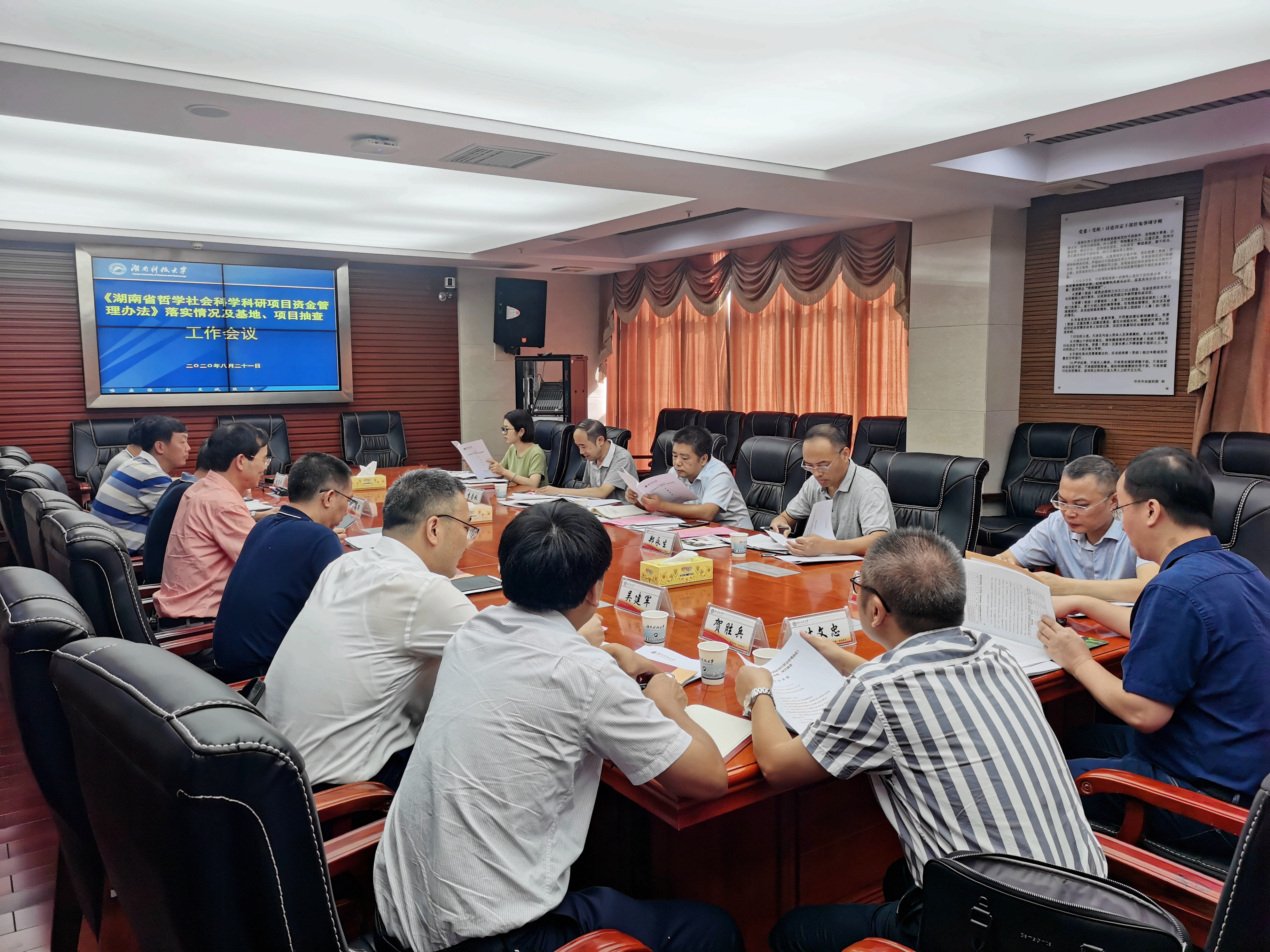 821日,省哲社规划基金办陈湘文主任一行来到我校,检查《湖南省哲学社会科学科研项目资金管理办法》落实情况、“湖南省新型工业化研究基地”建设情况、部分项目资金使用情况。汇报会在立德楼601会议室召开,校长朱川曲、副校长刘友金、校纪委书记刘宇文出席,社科处、商学院、湖南创新发展研究院及相关基地、项目负责人与会。副校长陈安华主持会议。