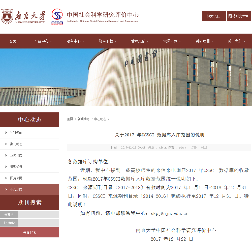 南京大学中国社会科学研究评价中心公告(CSSCI)