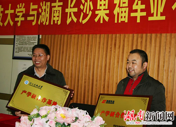 1月10日,我校与湖南长沙果福车业“产学研合作基地签约授牌仪式”在长沙县果园镇果福工业园举行。副校长刘友金出席,科技处、长沙果福车业有限公司相关负责人参加。