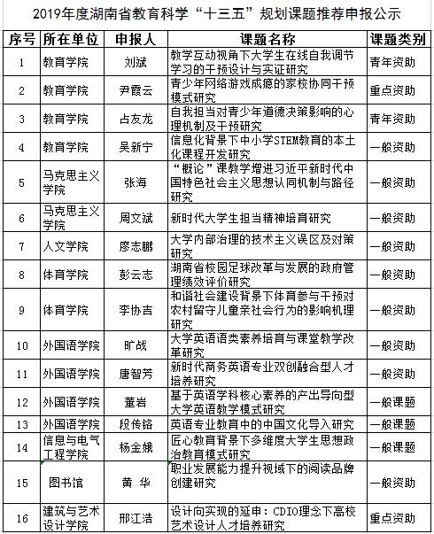 根据 湖南省教育厅 关于做好湖南省教育科学“十三五”规划 2019年度课题组织申报工作的通知 》( 湘教通 [201 9 ] 22 号) 相关规定, 结合学校实际, 社科处 2019131 拟定了校内申报办法 截止规定日期, 全校共 收到申报材料 35份, 经资格审查、 专家组会议匿名评审推荐 ,共有 16个项目获得推荐申报资格(名单如下) ,现予以公示 公示期 如有异议,请于201 9 3 22 17:30 之前以书面形式将意见反馈到社科处。