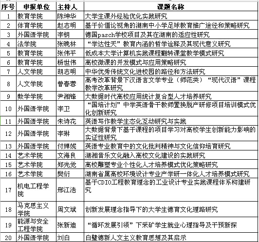 根据省教育厅《关于做好湖南省教育科学“十三五”规划2016年度课题组织申报工作的通知》(湘教通〔201651号)文件相关精神,我校进行了该项目的申报组织工作。根据《通知》第五条“省教育科学规划课题尚未完成的主持人不得申报本年度课题”、“不支持已有两个以上其他来源的在研项目的主持人再次申报省教育科学规划课题”的规定,社科处对申报资格进行了筛查工作,其中符合申报条件的共32人,根据省教育规划办下达的推荐指标,我校今年可推荐20人上报,经过专家委员会评审,以下申报选题获得推荐: