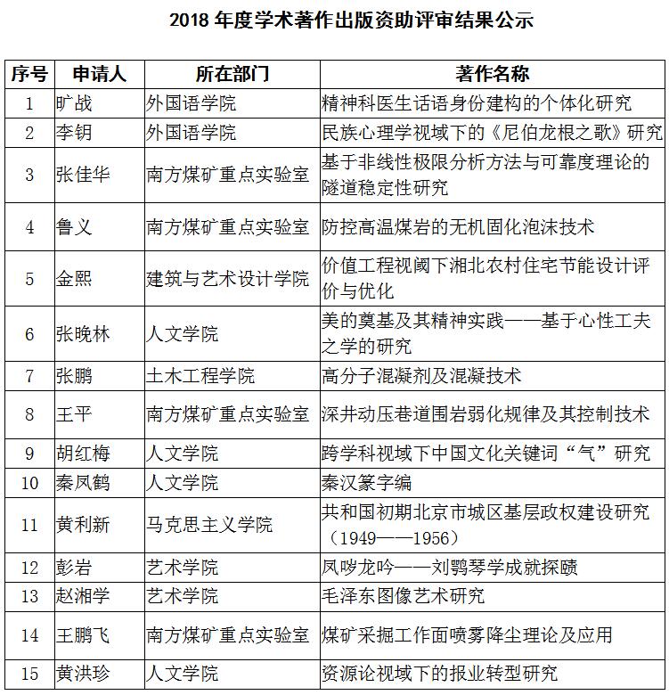 为了进一步促进科学研究,提高我校科研水平,鼓励和支持教师多出学术精品力作,根据《永利yl23411学术著作出版基金管理办法》(科大政发[2014]74号)相关规定,社科处、科技处组织了201 8 年度学术著作出版资助申报工作。201 8 年,全校共申请学术著作出版资助 22 部(其中自然科学类 9 部,人文社科类 13 部),经资格审查、校外专家盲审、校 学术 委员会集中评审,共有 15 部学术著作获得学校出版资助 ,现予以公示 公示期 如有异议,请于201 8 1 0 29 日之前以书面形式将意见反馈到社科处、科技处。若无异议,公示期结束后,请获得资助的老师到社科处领取书稿1 专家评审意见表,并根据专家评审意见进行相应修改。